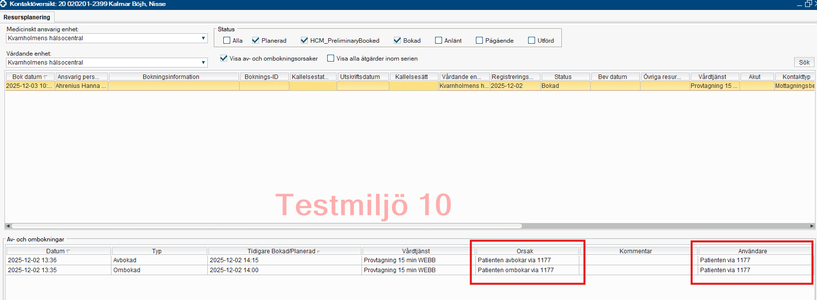 Under vecka 2 och 3 kommer om- och avbokningsorsak som visas när patienten om-/avbokar en tid via 1177 att byta namn. Numera heter orsakerna Patienten ombokar via MVK och Patienten avbokar via MVK. Efter ändringen kommer orsakerna vara Patienten ombokar via 1177 resp. Patienten avbokar via 1177. Även namnet på användaren byter namn från "Mina Vårdkontakter Patient" till "Patienten via 1177". Detta görs för att få en mer tydlighet samt att MVK (Mina vårdkontakter) inte längre används.