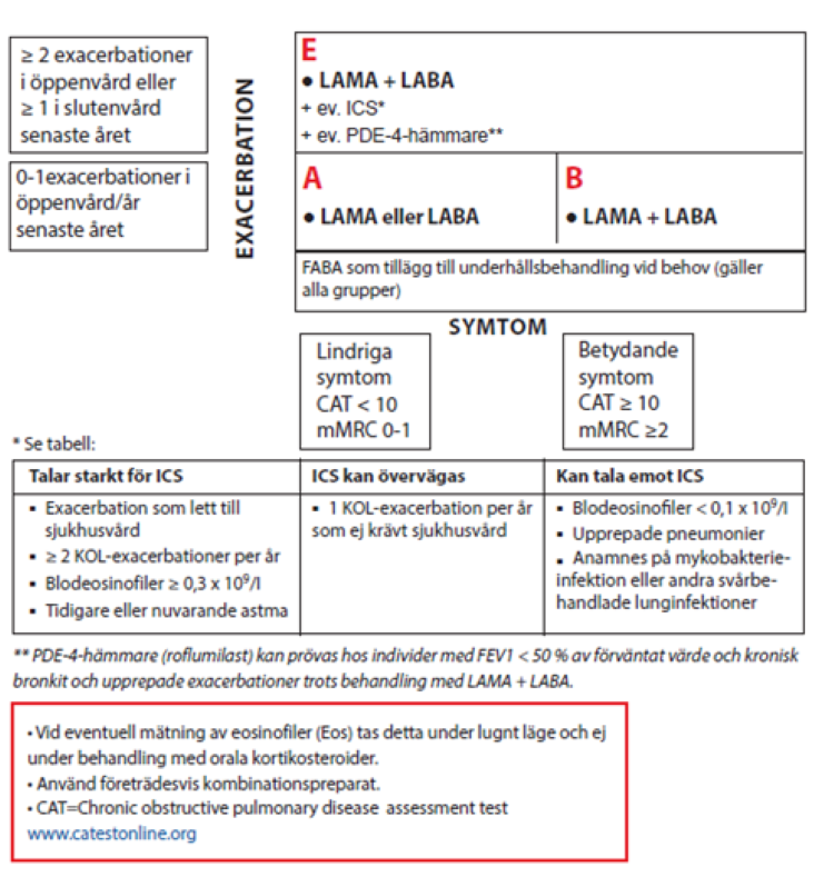 Riktlinjerna för KOL från Läkemedelsverket och GOLD lyfter betydelsen av eosinofiler i blod. Nivåerna kan ge beslutstöd för underhållsbehandling med ICS för patienter med upprepade exacerbationer. Eosinofiltalet ska mätas i stabil fas och ej under/eller strax efter oral steroidkur (tidigast 4-6 veckor efter exacerbation/po steroidkur). Data talar även för återhållsamhet med ICS vid upprepade pneumonier.